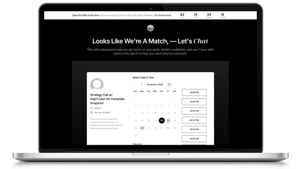 You get the complete Offers That Scale On Demand Coaching, including all forms, booking calendar, legal pages, and plug-and-play copy, ready to drop into HighLevel. You also get an extended 14-day HighLevel free trial plus access to a live setup bootcamp to help you get everything installed and running properly.